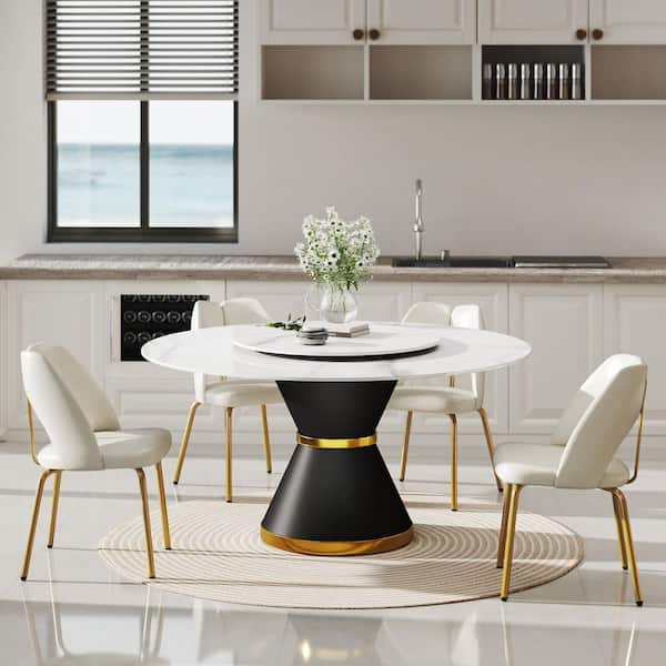 59.05 in. Modern White Round Rotary Lazy Susan Sintered Stone Top Black Carbon Steel Pedestal Dining Table (Seats-8)