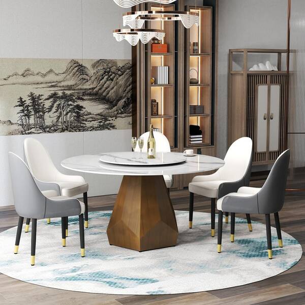 59.05 in. White Circular Rotable Sintered Stone Tabletop with Lazy Susan Pedestal Base Kitchen Dining Table (Seats-8)