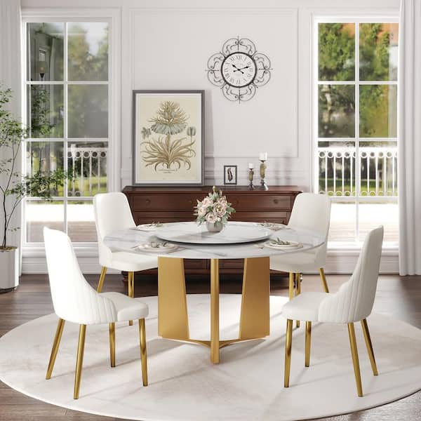 59.05 in. White Lazy Susan Sintered Stone Tabletop with Gold Pedestal Base Dining Table (Seats-8)