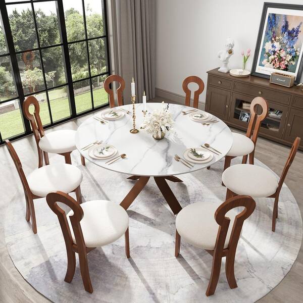 59.05 in. White Round Sintered Stone Tabletop with Dark Walnut Carbon Steel Legs Pedestal Base Dining Table(Seats-8)