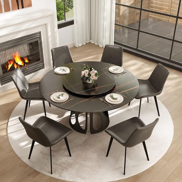 59 in. Black Lazy Susan Sintered Stone Tabletop with Black Pedestal Base Dining Table (Seats-8)