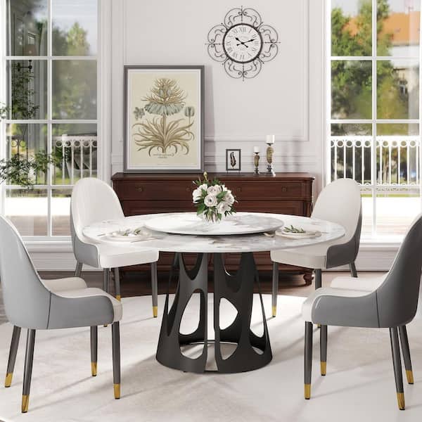 59 in. Pandora Lazy Susan Sintered Stone Tabletop with Black Pedestal Base Dining Table (Seats 8)