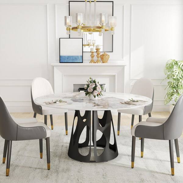59 in. Pandora Round Sintered Stone Tabletop with Black Metal Pedestal Base Dining Table (Seats 8)