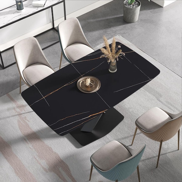 63 in. Black Pattern Rectangle Sintered Stone Top Pedestal Black Carbon Steel Base Dining Table (Seats-6)