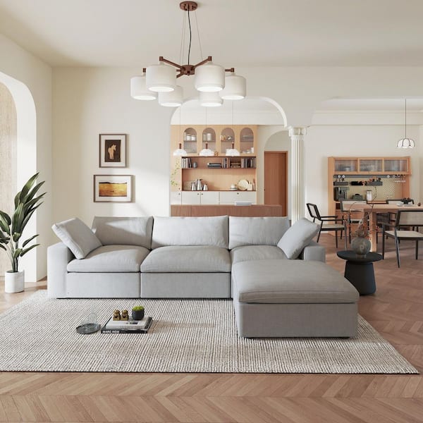79 in. Modular Gray Linen Down Filled Full Size 3-Seat Convertible Sleeper Sofa Bed with Storage Ottoman, Washable Cover