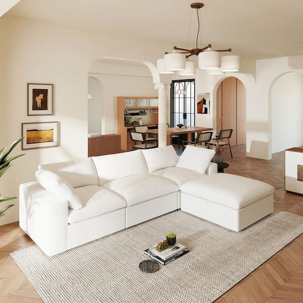 79 in. Modular White Linen Full Size 3-Seat Storage Sleeper Sofa Bed with Ottoman, Removable Cover for Small Spaces