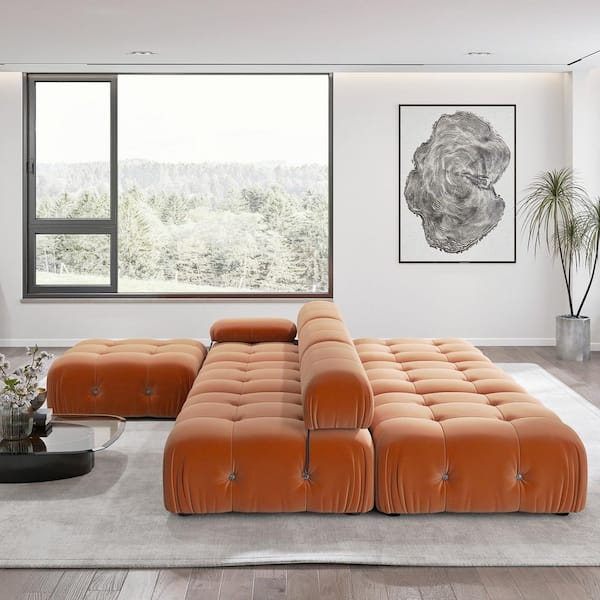 Chameleon 104 in. Square Arm Minimalism 7-piece Modern Velvet Modular Combination Sectional Sofa with Ottomans in Orange