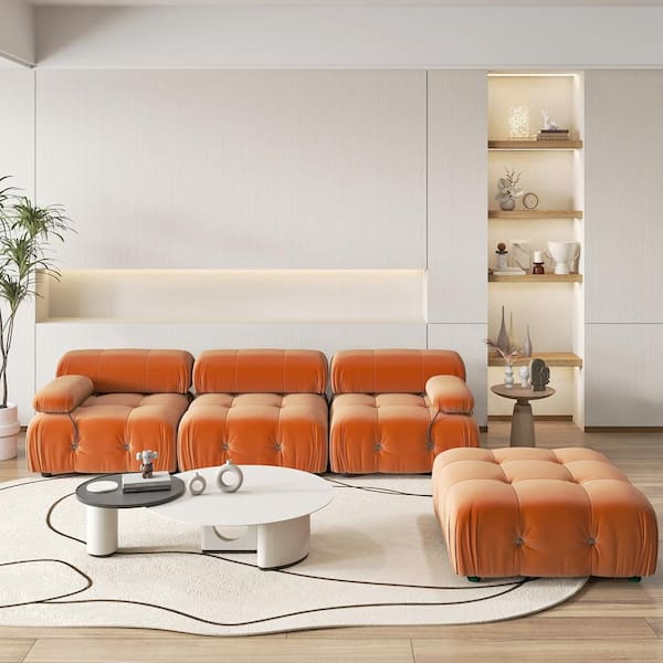 Chameleon 104 in. Square Arm Oversized 4-Piece Modern Velvet Modular Combination Sectional Sofa with Ottoman in Orange