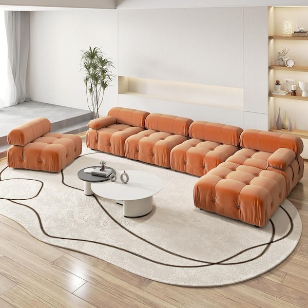 Chameleon 138 in. Square Arm 6-piece Modern Velvet Modular Combination Sectional Sofa Living Room with Ottoman in Orange
