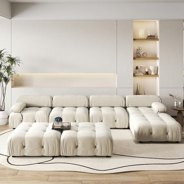 Chameleon 138 in. Square Arm 7-piece Modern Velvet Modular Combination Sectional Sofa Couch with 3 Ottomans in Beige