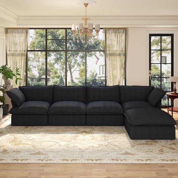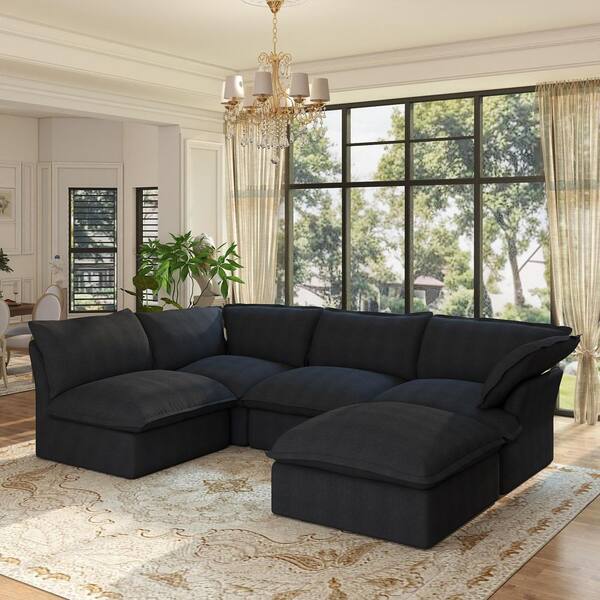 Down Filled 163 in Flared Arm 5-Piece Linen L-shaped Modular Cloud Sectional Sofa with Washable Cover Ottoman in Black