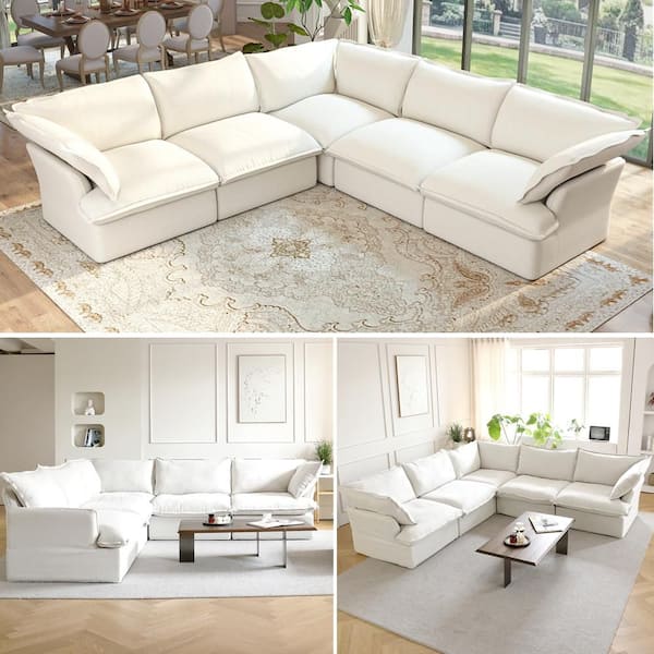 L-shaped Convertible 123 in. Flared Arm Linen Comfy Modular Cloud Sofa with Detachable Covers in. White