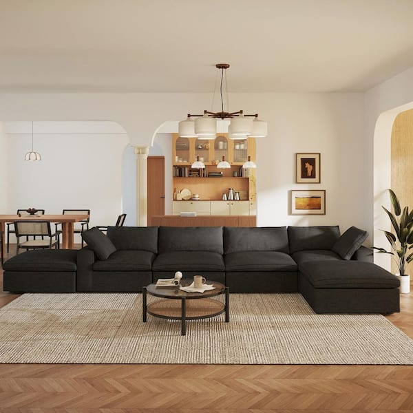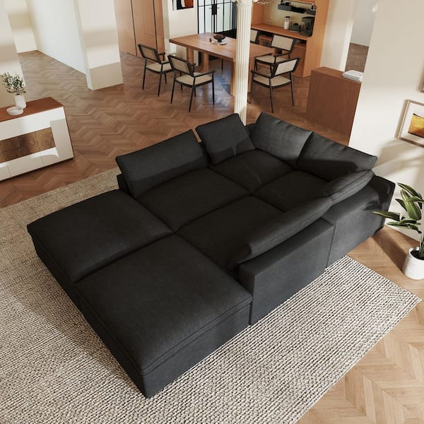 Large Storage 157 in. Square Arm Linen 8-Piece Down Filled Pinewood Cloud Modular Tuxedo Sofa in White with 2-Ottomans