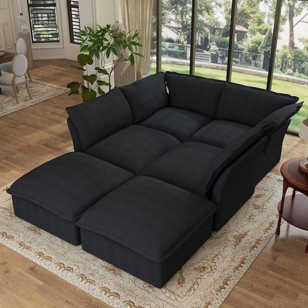 Large Storage 163 in. Flared Arm 6-Piece Linen Modular Cloud Sectional Sofa with Removable Covers 2 Ottomans in. Black