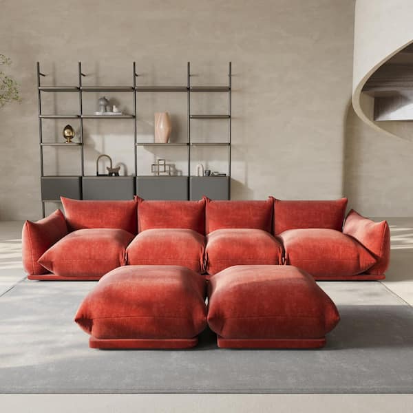 Marenco 131 in. Flared Arm Chenille Lawson U-shaped Modular Sofa Reversible 4-Seat Couch with 2 Ottomans in. Orange