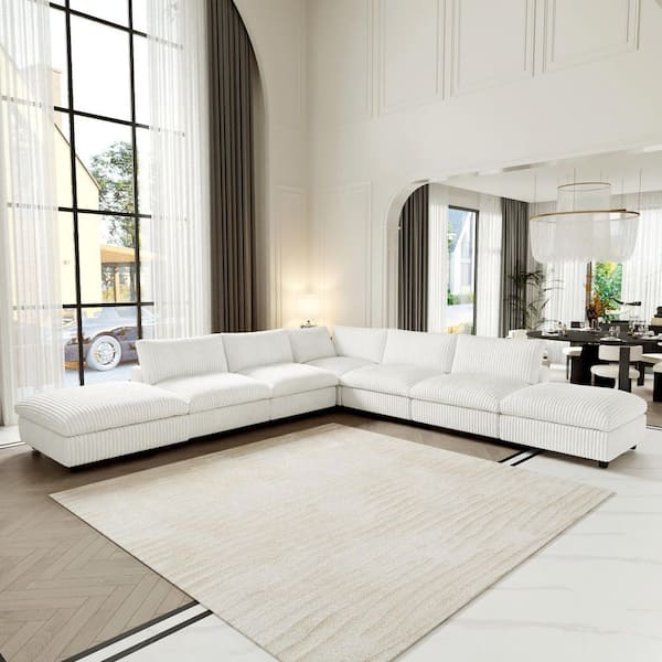 Modern 157 in. Square Arm Soft Faux Rabbit Fur Velvet Modular Cloud Sectional Sofa 7-Seater with Ottomans in Beige