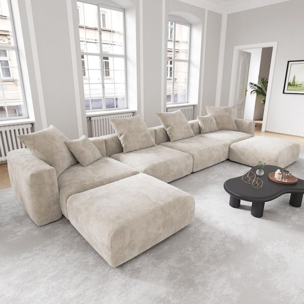 Modern 181 in. Square Arm 6-piece Modular Corduroy Sectional Sofa Oversized U-shaped Floor Couch with Ottomans in. Beige
