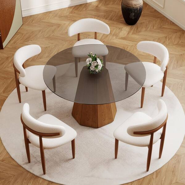 Modern 53.15 in. Black Round Tempered Glass Tabletop Dining Table with Walnut Pedestal Base (Seats 6)