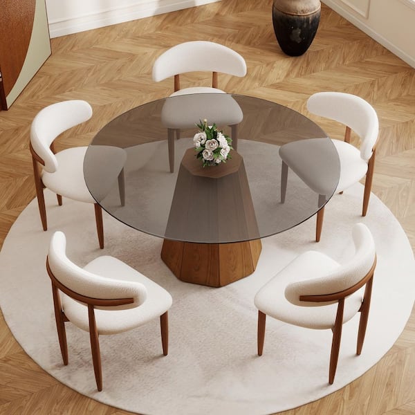 Modern 59.05 in. Black Round Tempered Glass Tabletop Dining Table with Walnut Pedestal Base (Seats 8)