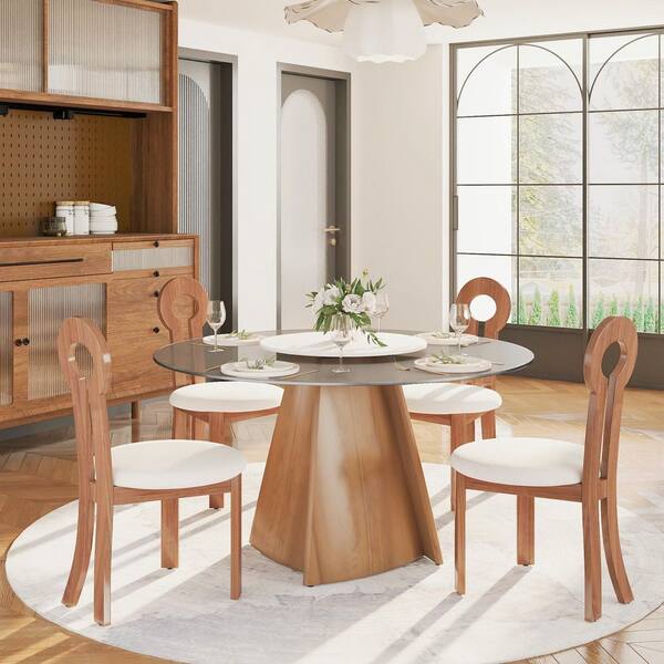 Round 53 in. Walnut Tempered Glass Tabletop with Rotable Lazy Susan and Pedestal Base Dining Table (Seats 6)
