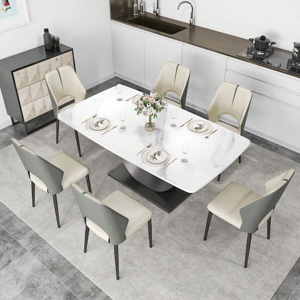 Set of 6 Modern Dining Chairs PU Leather Seat Curved Open Back with Black Iron Legs in Gray