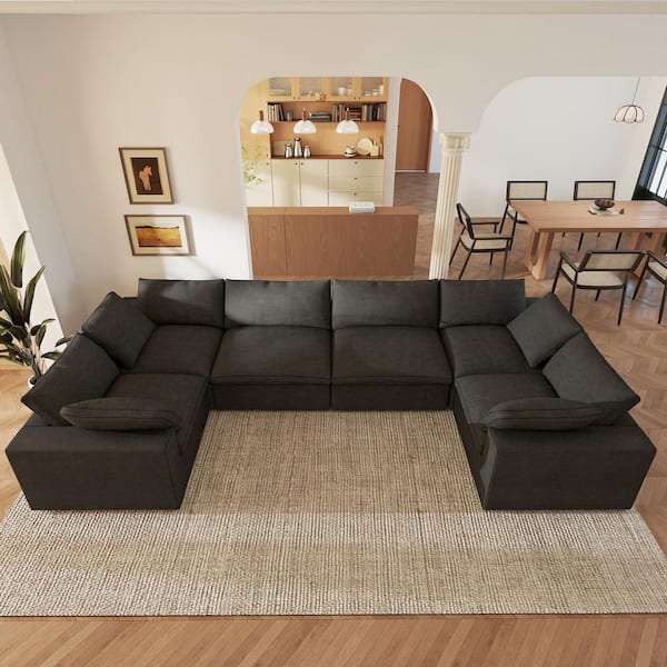 U Shape 157 in. Square Arm Linen 6-Piece Down Filled Convertible Cloud Modular Sectional Sofa in Black for Living Room