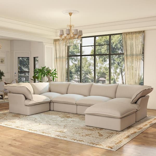V-shaped 123 in. Flared Arm 6-Piece Down Filled Linen Modular Sectional Sofa Corner Cloud Couch with Ottoman in. Beige