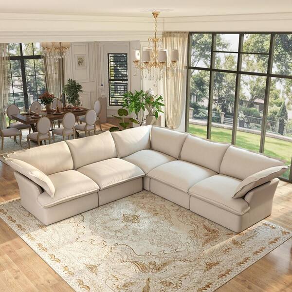 Wide Deep Seat 123 in. Flared Arm 5-Piece Down Filled Linen V-shaped Modular Sectional Sofa Corner Cloud Couch in. Beige