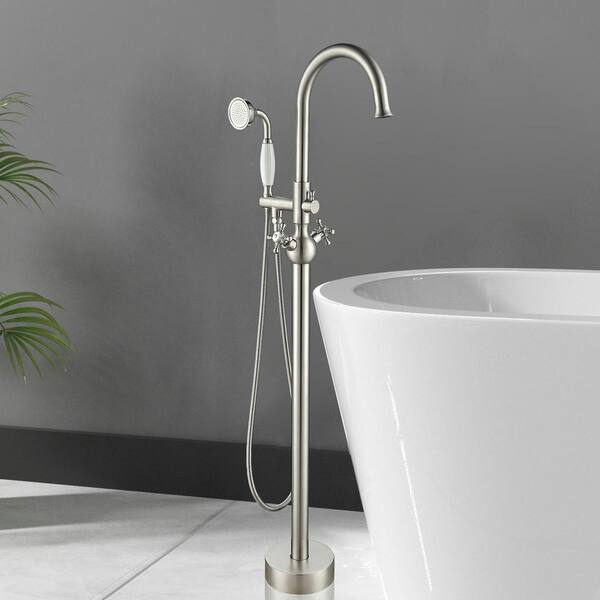2-Handle Floor Mount Freestanding Tub Faucet with Hand Shower in Brushed Nickel