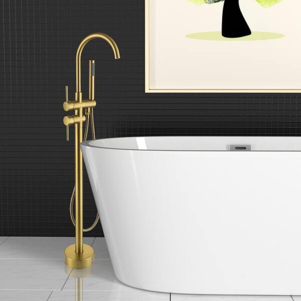2-Handle Floor Mounted Residential Freestanding Tub Faucet with Hand Shower in Brushed Brass