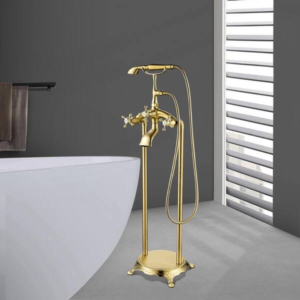 3-Handle Floor Mount Claw Foot Freestanding Tub Faucet with Hand Shower in Titanium Golden