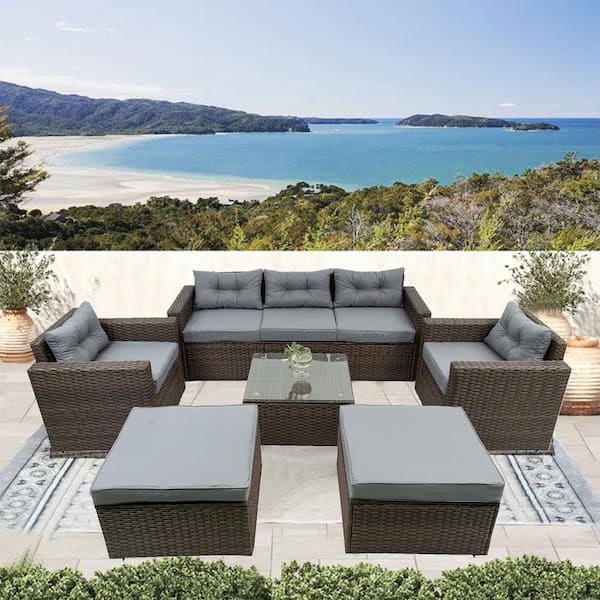 6-Piece Wicker Patio Conversation Set with Gray Cushions