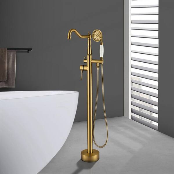 Classical Single-Handle Freestanding Tub Faucet with Hand Shower in Brushed Brass
