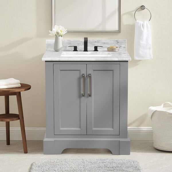 Free-Standing 30 in. W x 21.5 in. D x 33 in. H Bath Vanity in Gray with White Carrara Marble Top with Basin