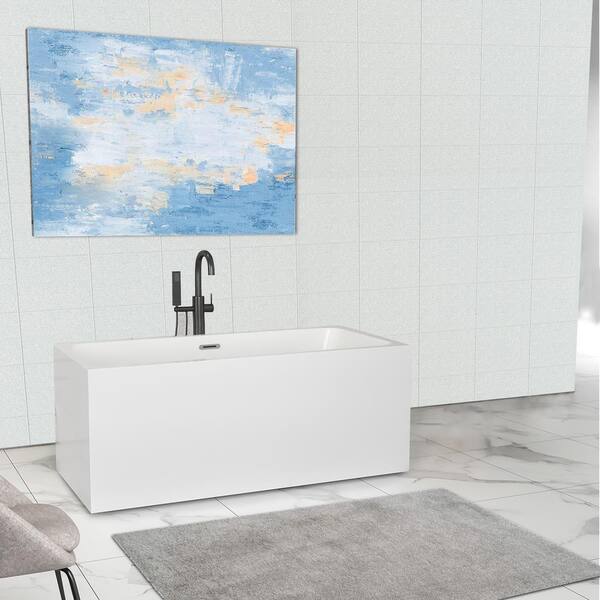 Freestanding 59 in. Acrylic Flatbottom Rectangular Center Drain Bathtub in White with Overflow and Pop-up Drain