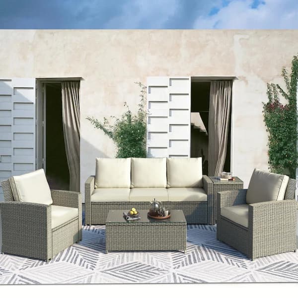 Gray 5-Piece Outdoor Wicker Patio Conversation Set with Beige Cushions, Side Table