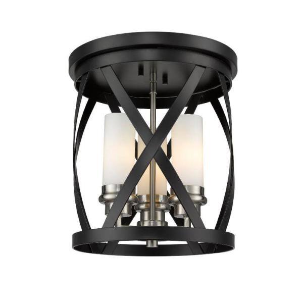 Malcalester 13 in. 3-Light Matte Black and Brushed Nickel Flush Mount with White Glass Shade