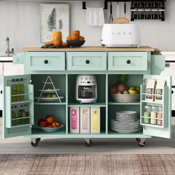 Mint Green Solid Wood Top 53.1 in. Kitchen Island with Drop Leaf, Cabinet door internal storage racks and 3 Drawers