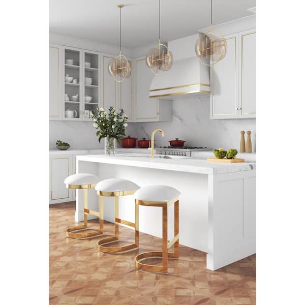 Aura 28.54 in. White and Polished Brass Metal Bar Stool with Faux Leather Upholstered Seat (Set of 3)