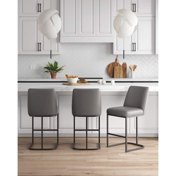 Serena 26.37 in. Modern Grey Metal Counter Stool with Faux Leather Upholstered Seat (Set of 3)