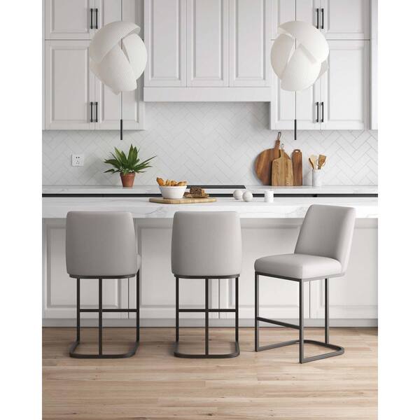 Serena 26.37 in. Modern Light Grey Metal Counter Stool with Faux Leather Upholstered Seat (Set of 3)
