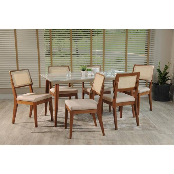 Utopia 70.86 in. and Pell 7-Piece White Gloss and Dark Beige and Maple Cream Dining Set