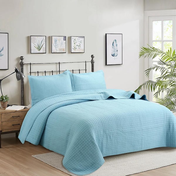 B70 3-Piece Blue Check 100% Cotton King Size Lightweight Quilt Bedspread Set