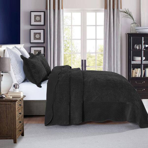 BYV302 Black Leaf and Vines Queen Size Polyester Velvet Quilt Bedspread Set