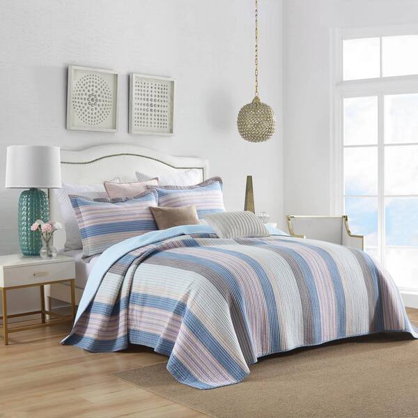 CP323 Blue Queen Size 100% Cotton Striped Quilt Set Lightweight Bedspread Set