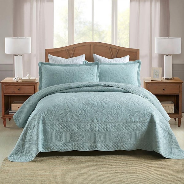 TF Angel Blue Embroidery Queen Size Cotton Lightweight Quilt Bedspread Set