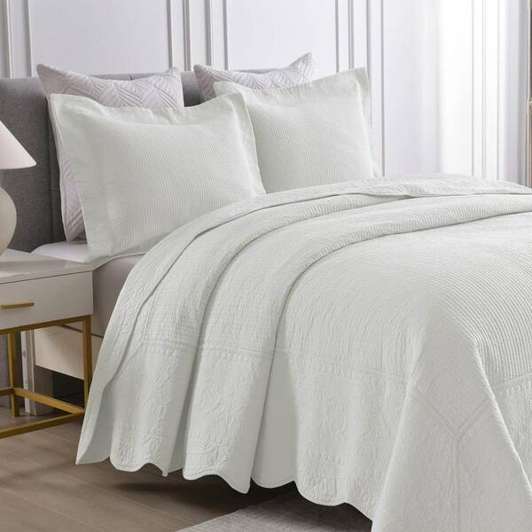 TG71 Soft White Elegantly Embroidered King Size Cotton Oversized Quilt Bedspread Set