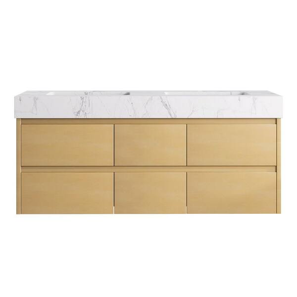 MarbleLux 48 in. W x 20.8 in. D x 21.2 in. H Wall Mounted Bath Vanity with 2-Sink in Birch Wood with White Marble Top