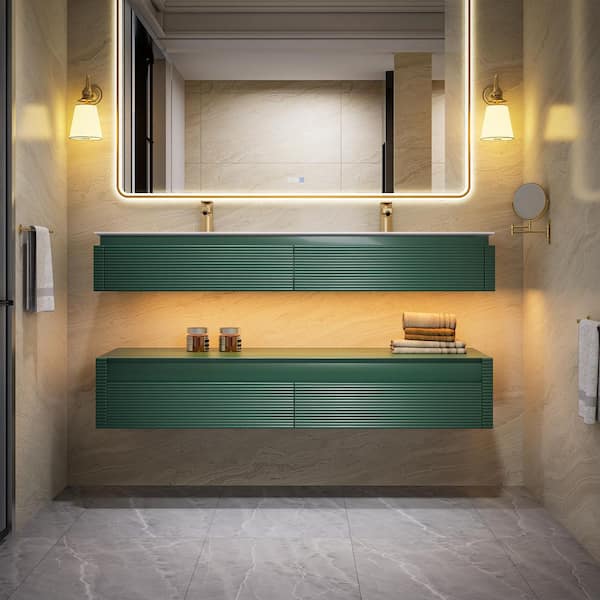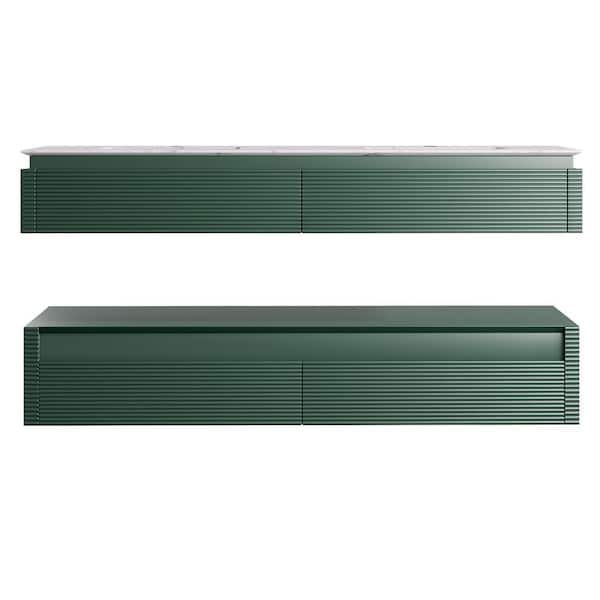 MarbleLux 60 in. W x 20.8 in. D x 21.2 in. H Wall Mounted 2-Tier Bath Vanity with 2-Sinks in Green w/ White Marble Top