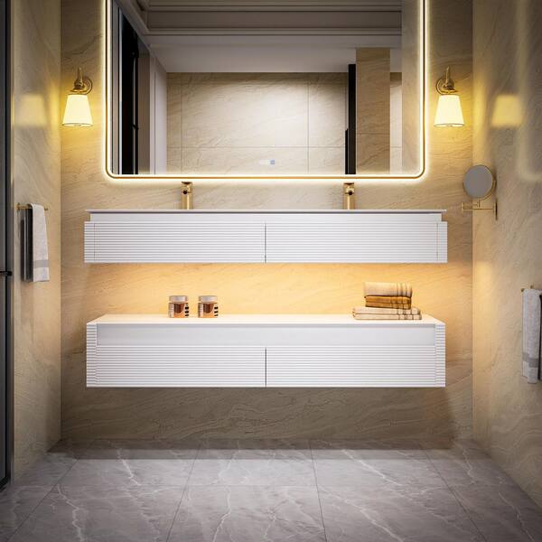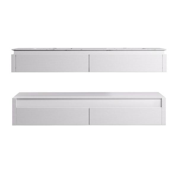 MarbleLux 60 in. W x 20.8 in. D x 21.2 in. H Wall Mounted 2-Tier Bath Vanity with 2-Sinks in White with Marble Top